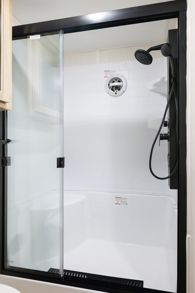 • Blackout Glass, Safety Slam, Friction Hinge Entry Door with Window and Shade Prep (N/A on LP models)