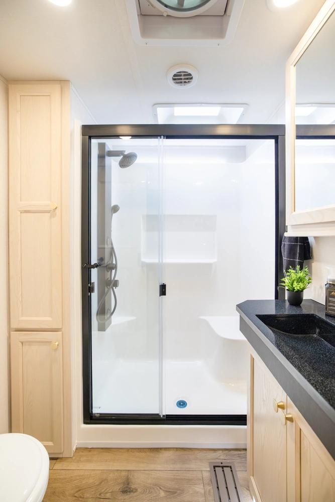 • Redesigned 48" x 30" Rectangular-Style shower with seat, sliding glass doors, and an Upgraded Shower Head