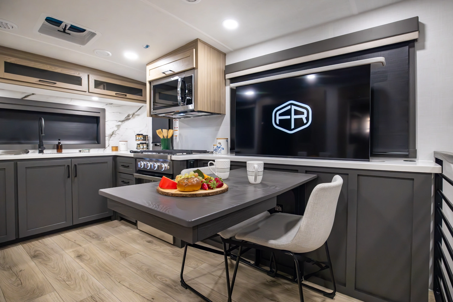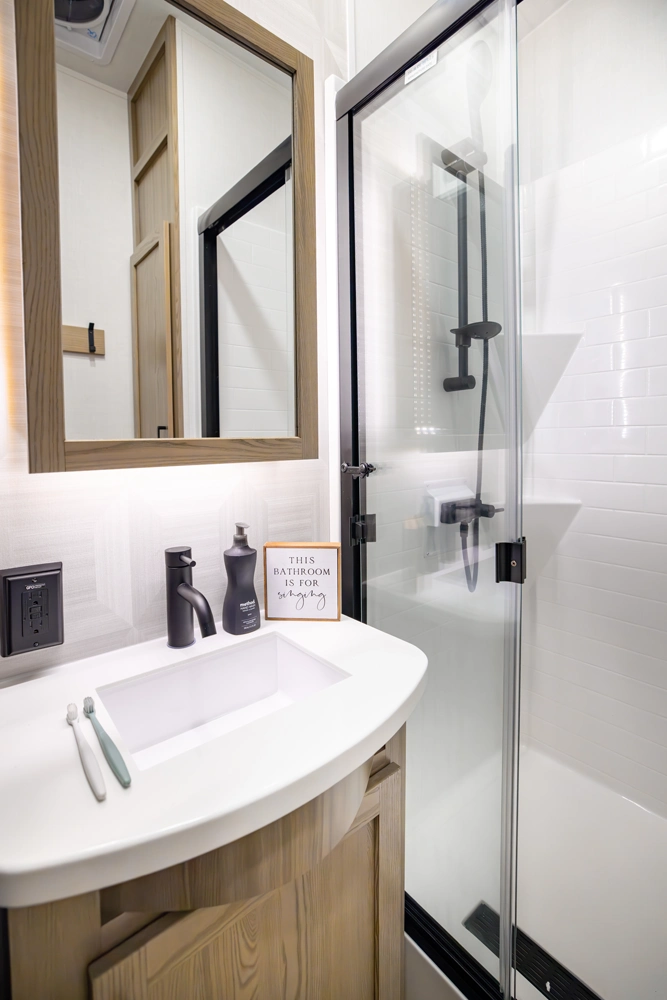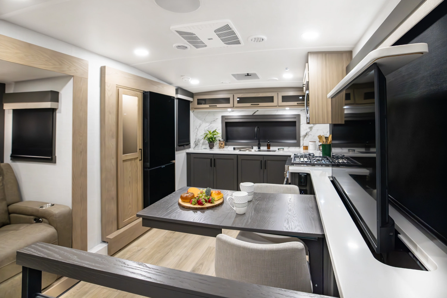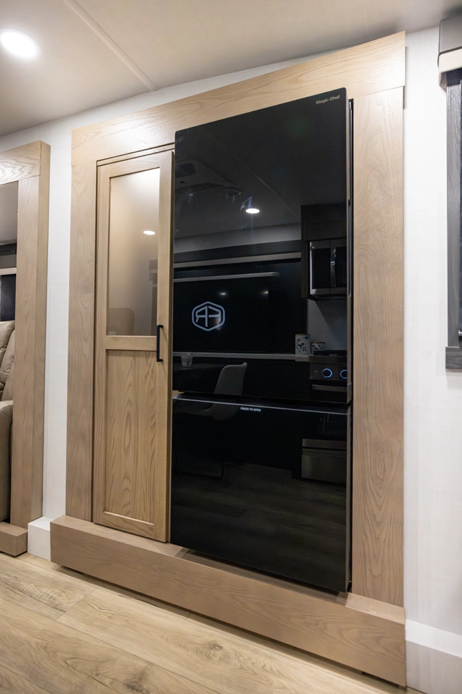 Our first front living fifth wheel under 30' delivers big luxury in a compact design! The front living area features a 60" theater seat, rotating dinette, and televator TV. The kitchen offers a full pantry, fridge, and ample counter space, while the rear bedroom includes a queen bed (king optional), wardrobe, vanity, and washer/dryer prep. With dual awnings and pass-thru storage, it’s perfect for easy towing and upscale comfort.