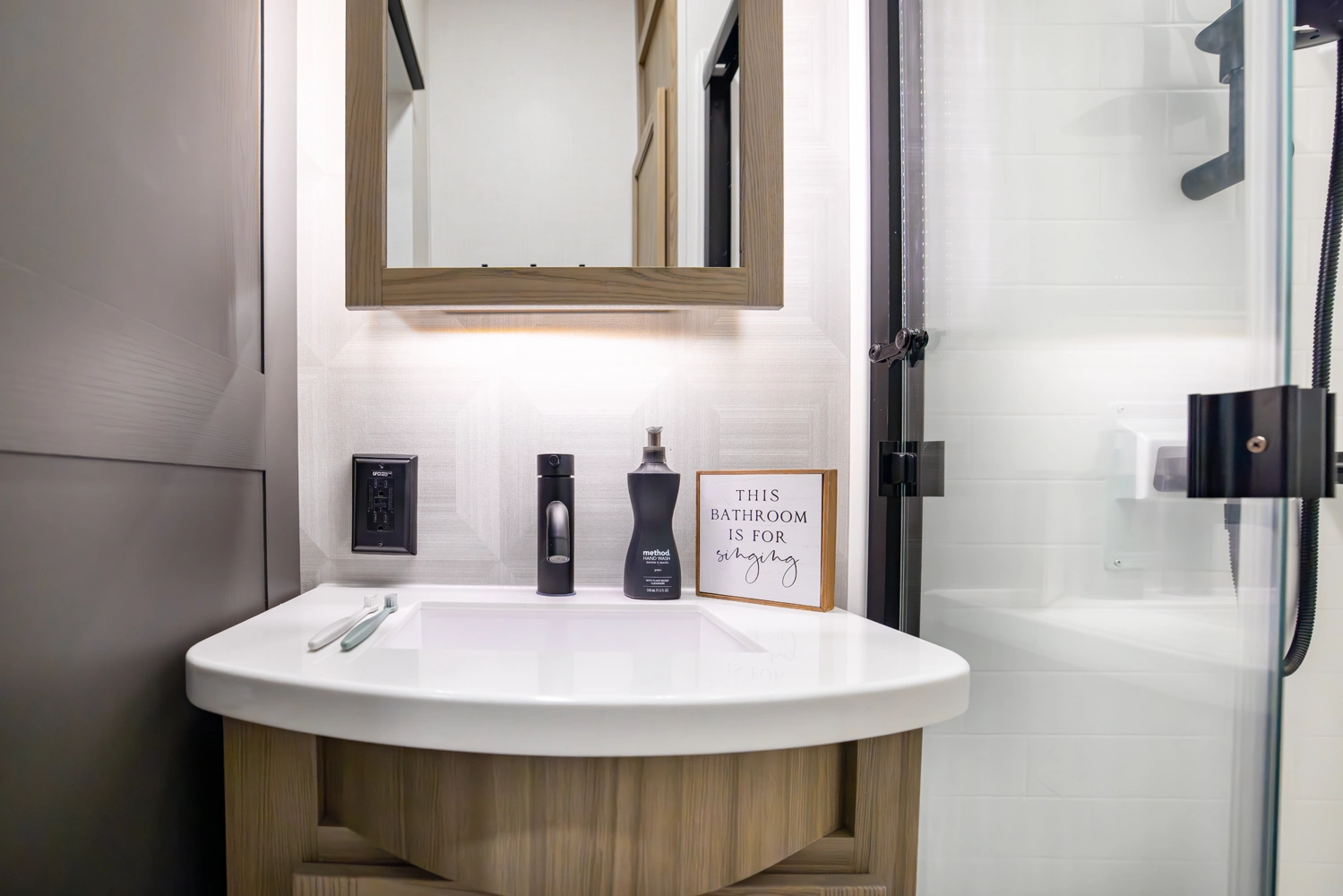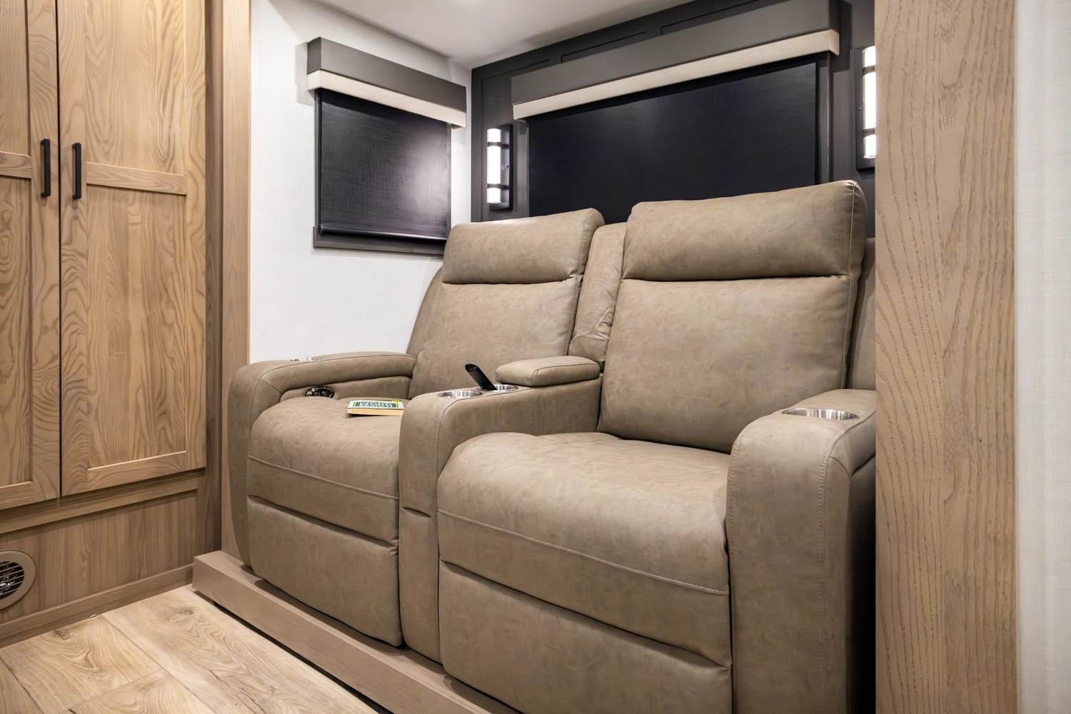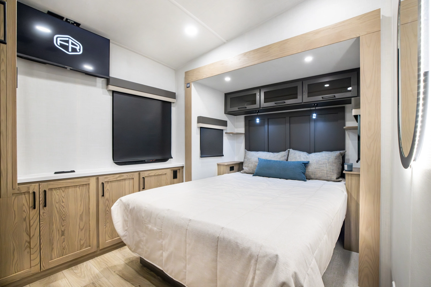 Our first front living fifth wheel under 30' delivers big luxury in a compact design! The front living area features a 60" theater seat, rotating dinette, and televator TV. The kitchen offers a full pantry, fridge, and ample counter space, while the rear bedroom includes a queen bed (king optional), wardrobe, vanity, and washer/dryer prep. With dual awnings and pass-thru storage, it’s perfect for easy towing and upscale comfort.