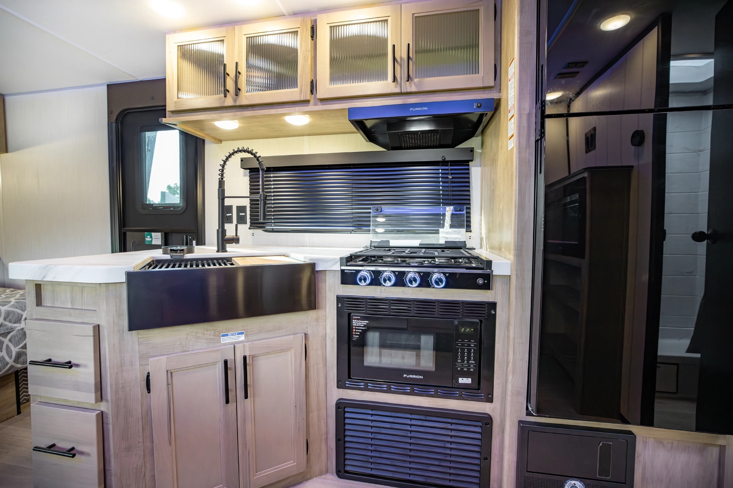 • Blackout Glass, Safety Slam, Friction Hinge Entry Door with Window and Shade Prep (N/A on LP models)
