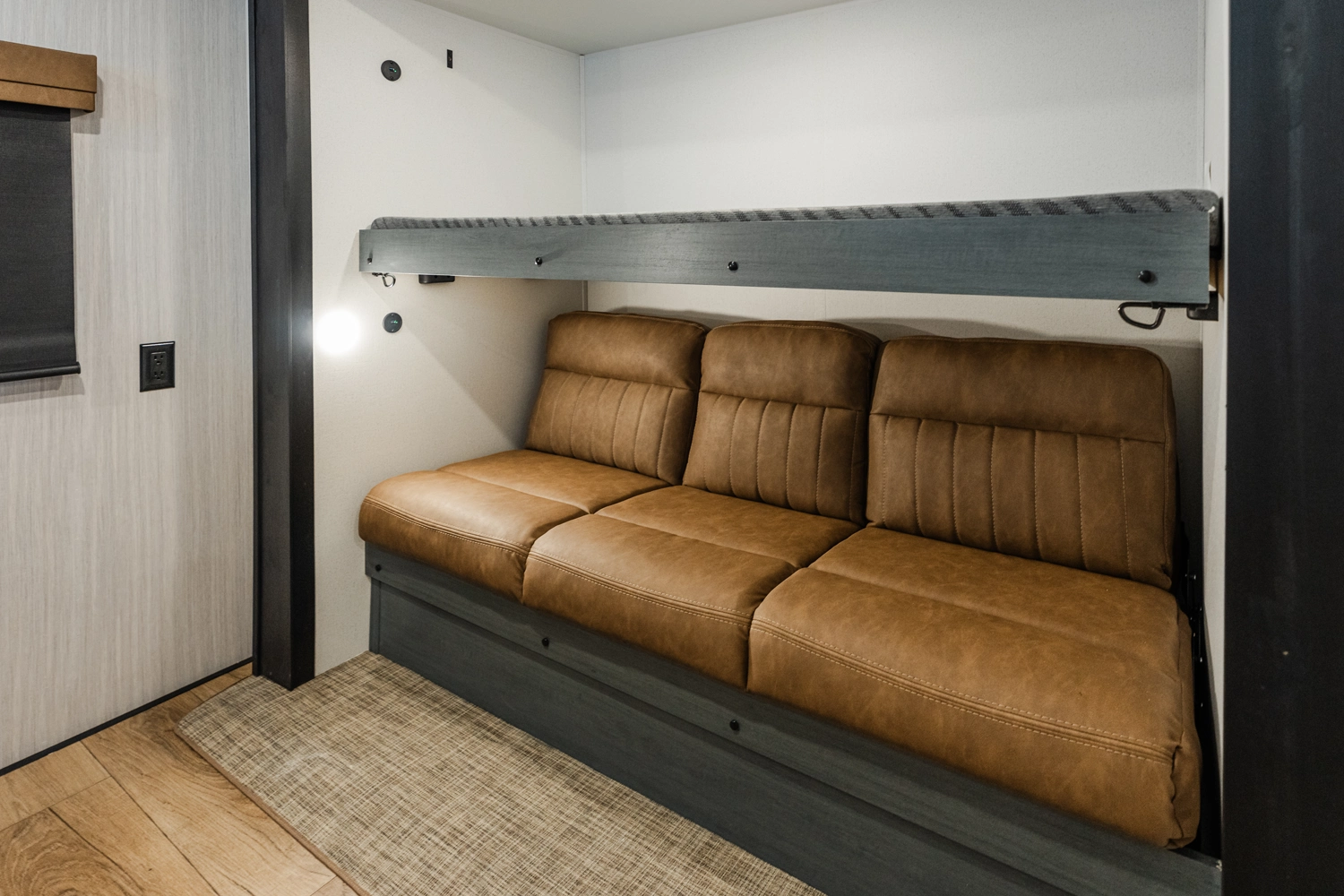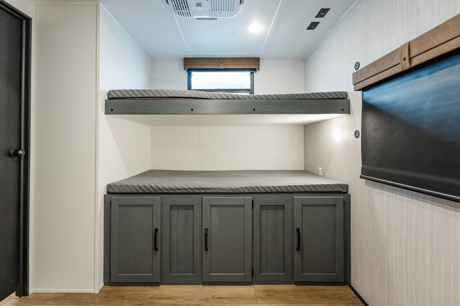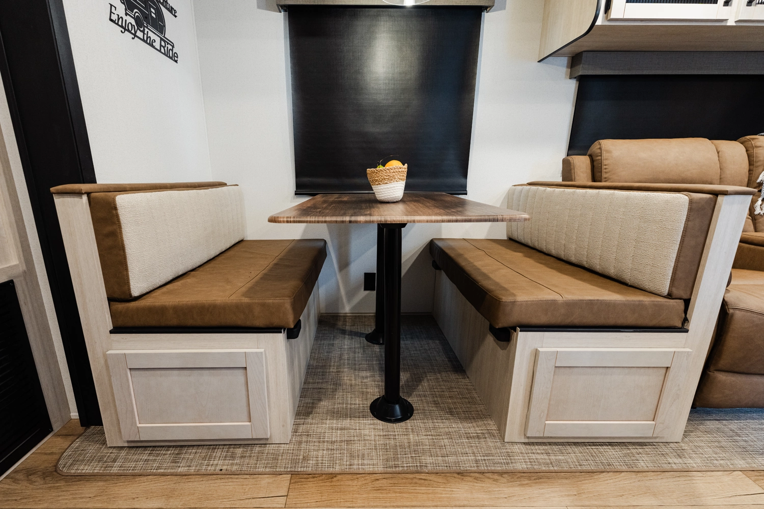 This bunk house travel trailer supplies you a great deal of space in the front bedroom. With a slide out and a large closet for all of your clothes, it will feel like your bedroom at home. The bunk house in the rear provides space for all guests to be comfortable and to make things a cut above, this floor plan provides two bathrooms. Furthermore, the exterior mini camp kitchen features a fridge and a griddle for those of you who like to cook in nature.