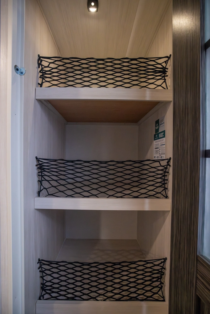 The RP-197 combines lightweight towing with a versatile layout. A front Murphy bed converts to a sofa for extra living space, while the rear full bath adds convenience. The kitchen and living area feature a bar top with a flip-up window, ideal for serving or relaxing outdoors. Modern finishes and smart storage make this trailer perfect for couples or small families seeking comfort on the road.