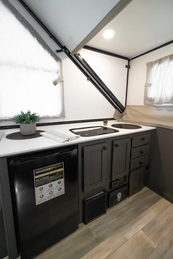 The Rockwood A123RG is a compact A-frame that offers practical comfort for your travels. Inside, you'll find a rear gaucho bed, a cooktop, a small refrigerator, and a wet bath—all designed for efficient use of space. Whether you're on a short trip or an extended adventure, this camper is ready to go with everything you need.