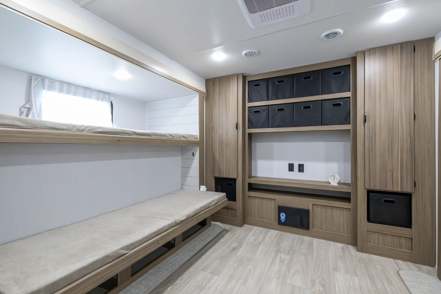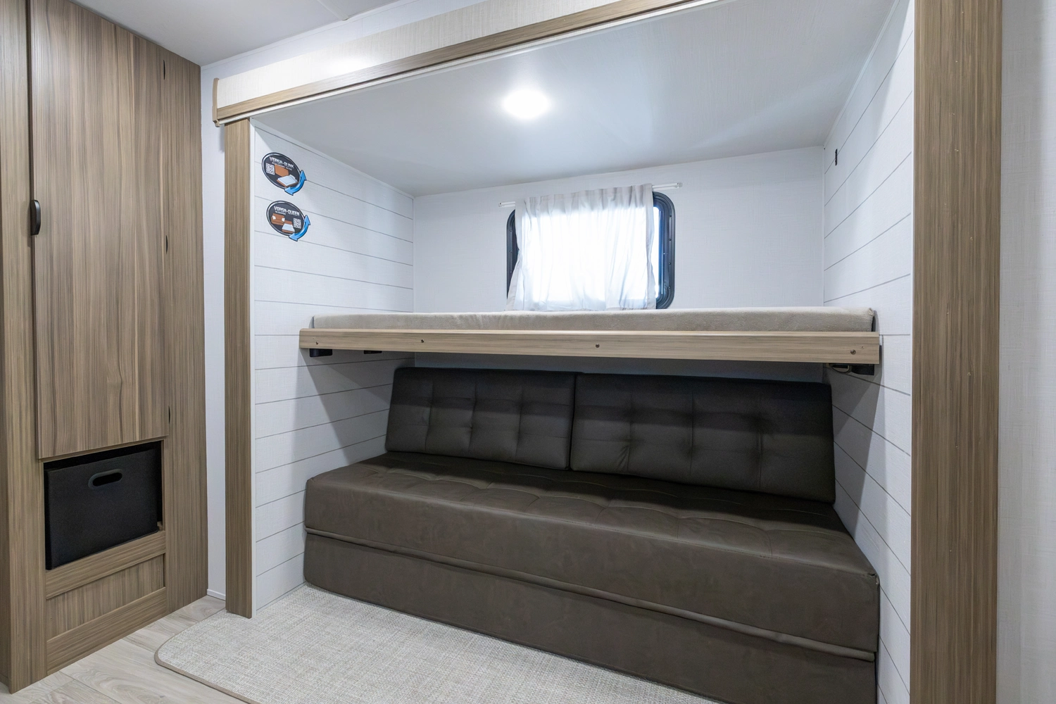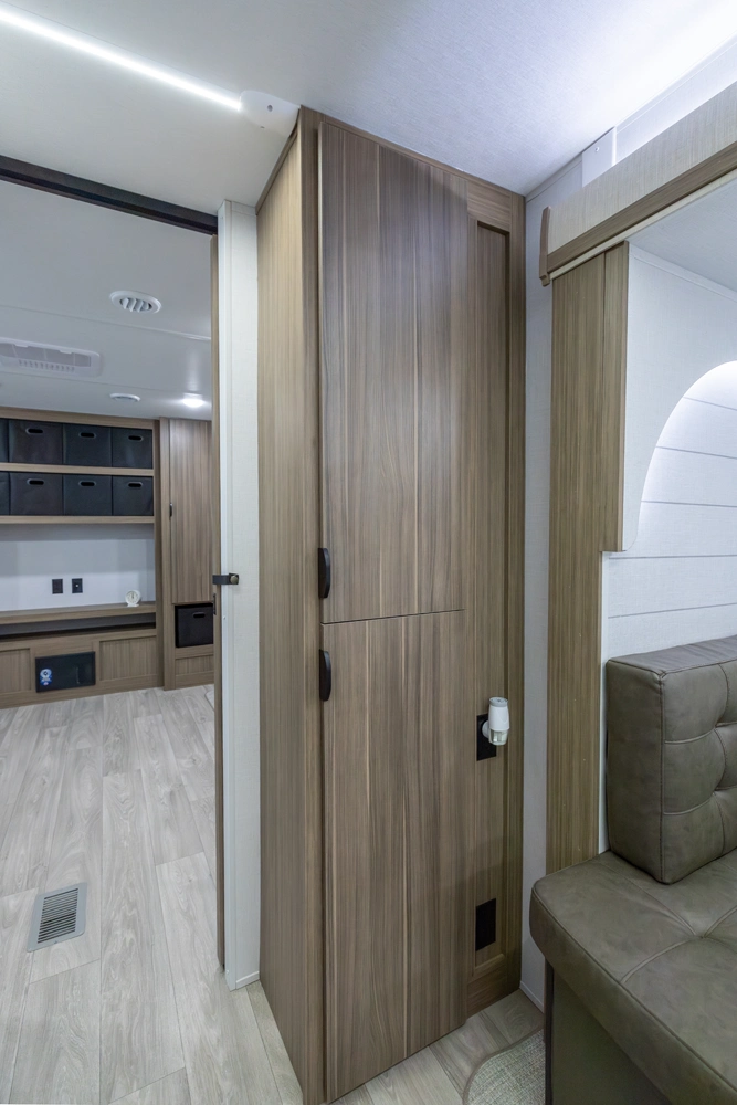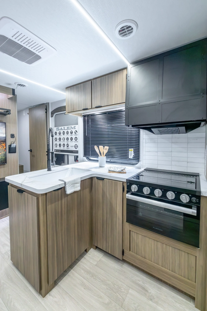 The 31KQBTS is the ultimate bunkhouse, with three total slide outs and an outside kitchen. This well-equipped travel trailer features oversized panoramic windows, the ever-popular U-dinette, which you can customize with the adjacent Versa-Lounge. The kitchen includes a 11 CU. FT. refrigerator and stovetop with oven and LED accents, plus cabinets for all your cooking essentials!