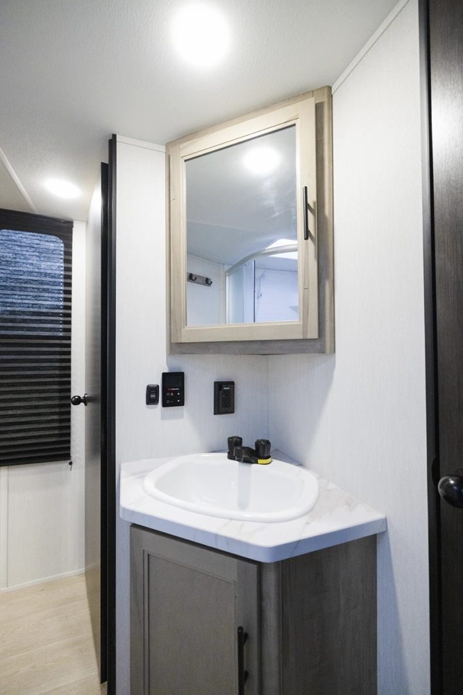 • Cherokee Black Label Wolf Den (Deep Tinted Frameless Automotive Glass Windows, High Gloss Gel Coat Exterior Sidewalls, Multicolor Reading Lights, Pillowtop Mattress Upgrade, Solid Surface Countertops, Thermo Foil Arctic Insulation)